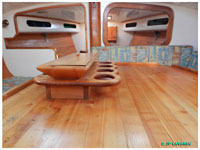 Aménagements intérieurs : Menuiseries en merisier du Canada, tous les plafonds sont en lame de PVC blanc. Couchette en 1m40 dans cabine arrière et poste avant. 1 cuisinière Eno deux feux à gaz. Bouteille de gaz dans caisson extérieur isolé.