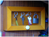 fixée par 4 vis à la cloison de la penderie 5 pitons et voilà une boite à clefs tout à fait acceptable
